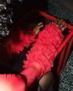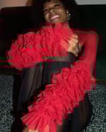 - adorned with ruffles around the bicep and aluminum eyelets along the sleeve opening