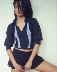 A fitted navy polo top