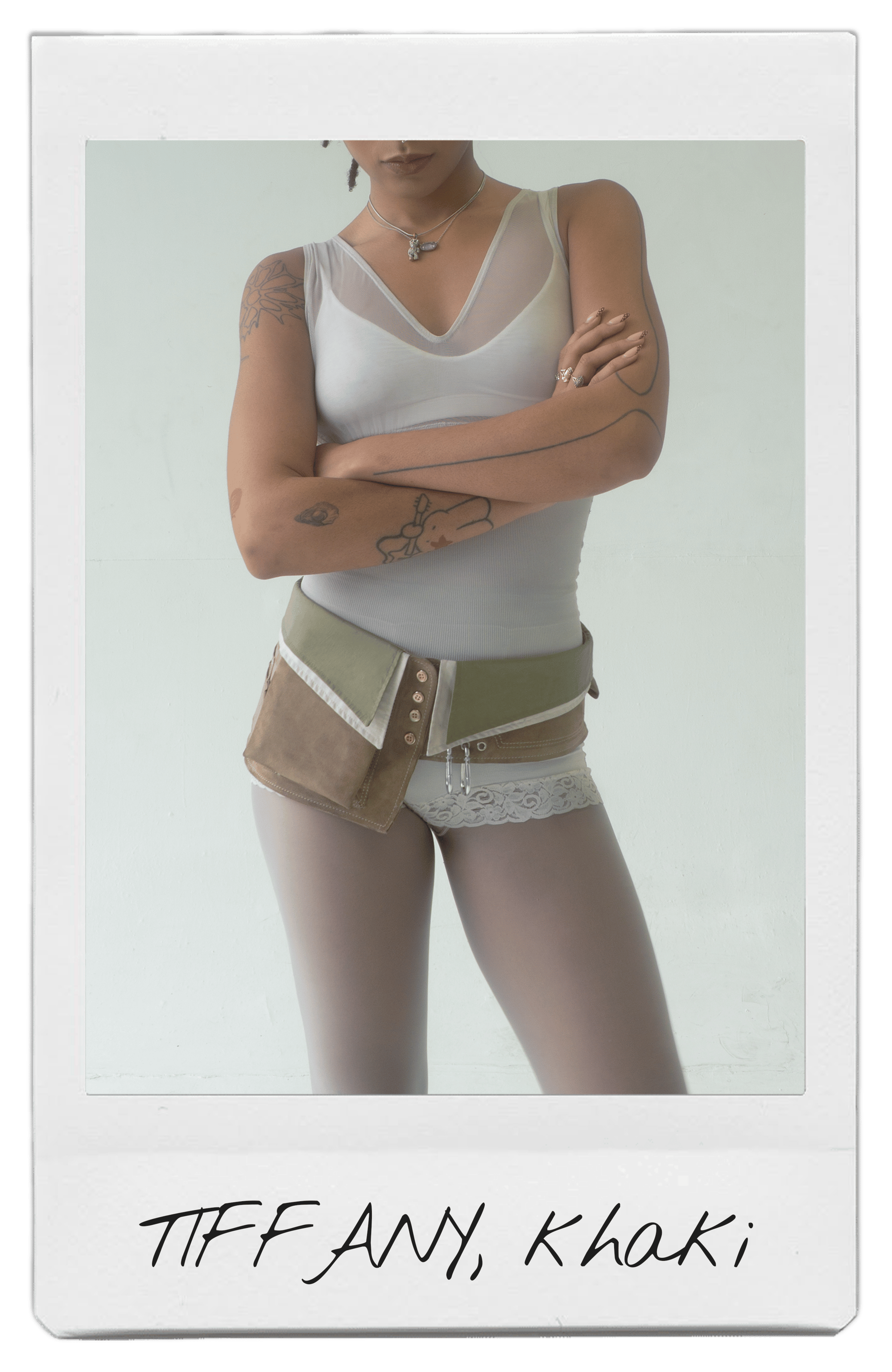 A multi-color utility belt featuring a front button up closure, back adjustable buckle closure, and four fully functional pockets designed for daily items, tools, or accessories – finished with metal grommets along the edge for hanging items such as keys, headphones, charms, or additional gear.